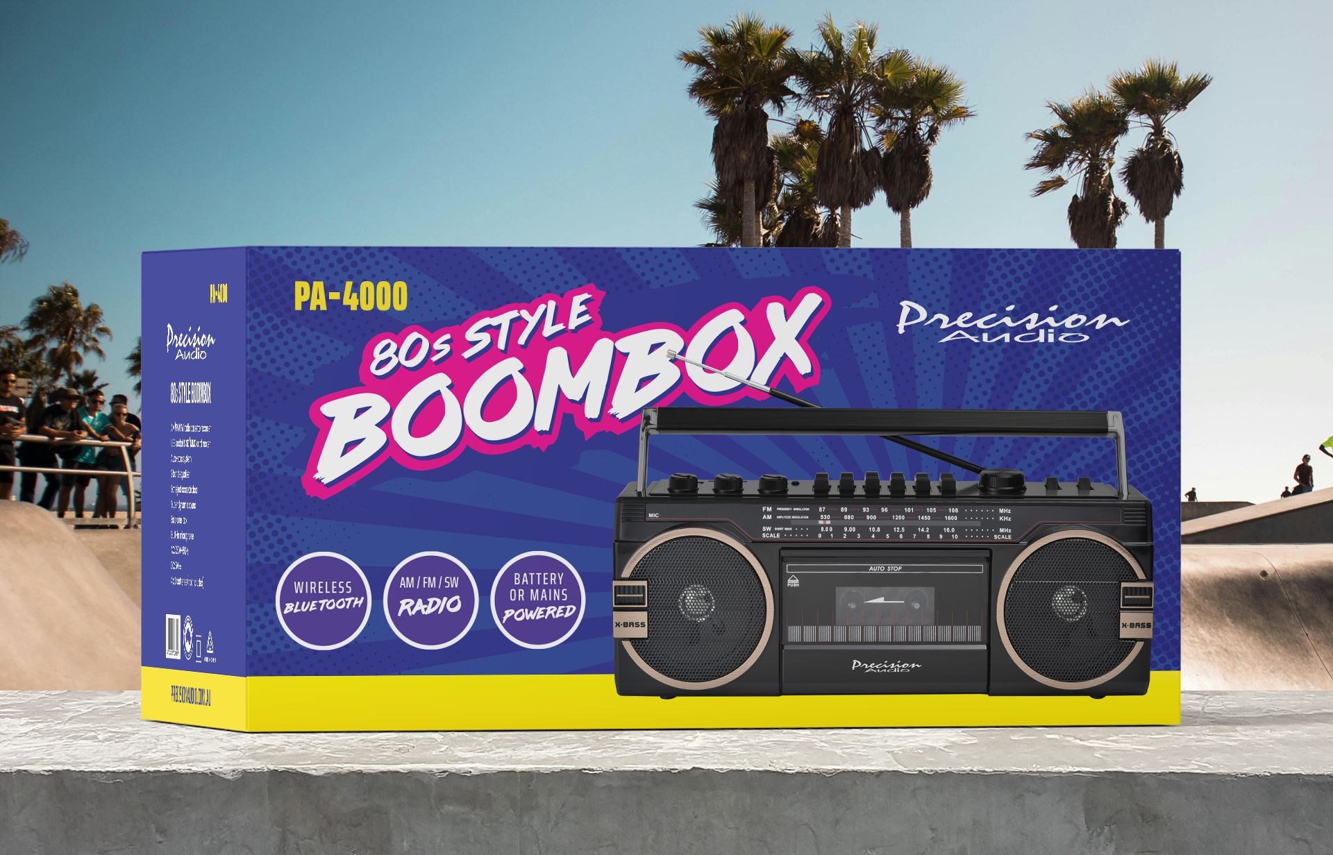This box packaging design request was for a retro style cassette player or “80’s Style Boombox”. I wanted this design to be a combination of a modern feel with added retro elements. I chose bold colours and youthful text to make the product stand out on shelf displays and capture the consumer’s attention.